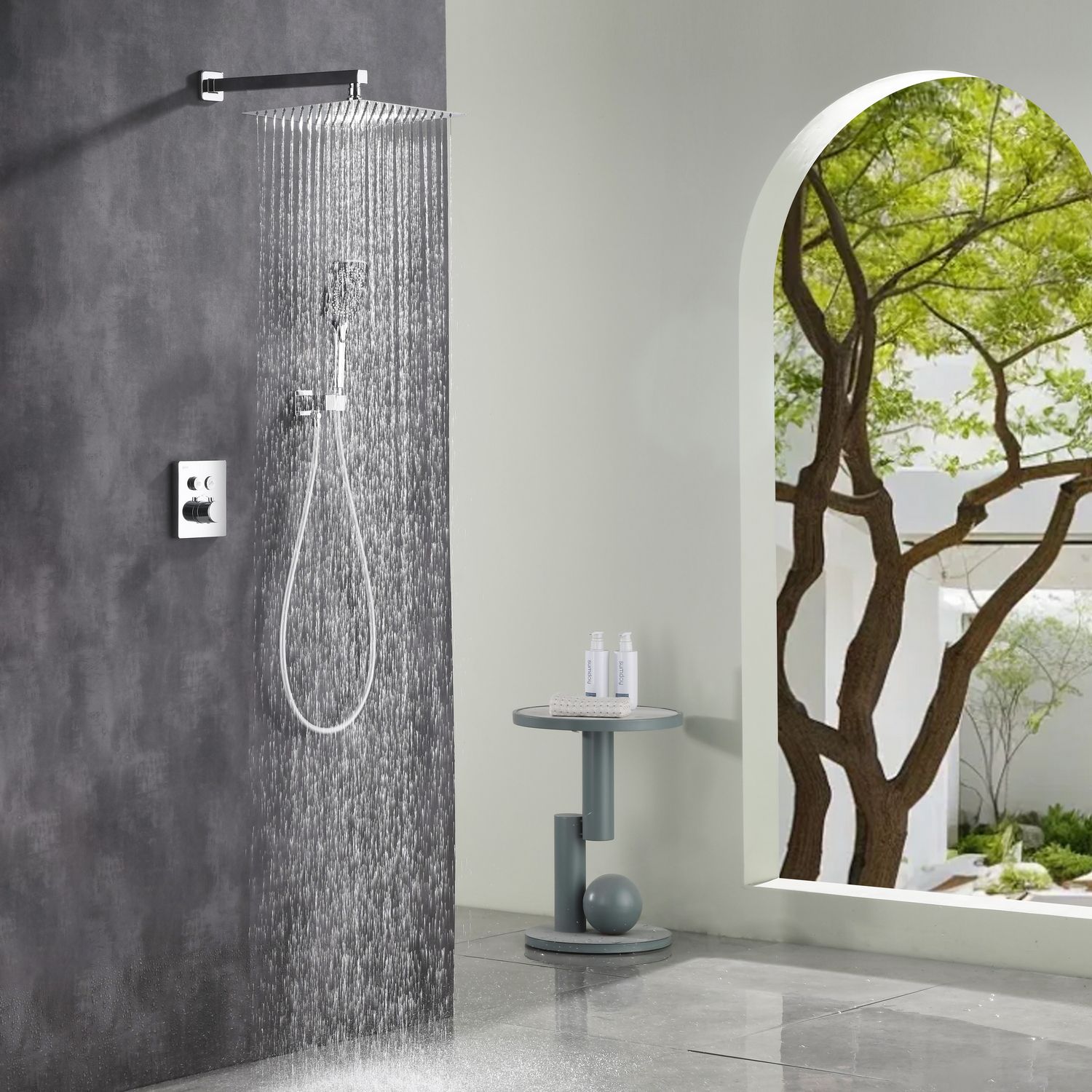 Готовое решение для душевой зоны скрытого монтажа датского производителя Black&White в цвете глянцевый хром. За управление давлением и температурой воды отвечает теромостатический смеситель постоянного потока , а для  выбора режимов работы установлены две кнопки цилиндрической формы, расположенные в квадратном корпусе смесителя.Из потребителей доступен ручной душ с режимами , а также  квадратная верхняя лейка на прямоугольном кронштейне. В дизайне изделия пересекаются квадратные и цилиндричсекие формы, которые гармонируют между собой создавая минималистичный облик, подходящий для большинства современных интерьеров