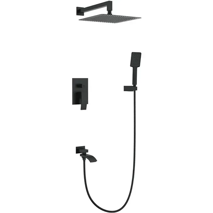 Душевая система скрытого монтажа Gappo G7117-6 выполнена из латуни в черном цвете, состоит из встроенного смесителя, верхнего тропического душа, поворотного излива для ванны (переключает подачу воды на лейку или верхний душ), ручной лейки (3 режима) и ее держателя, душевого шланга (150 см) и комплекта креплений. Однорычажный смеситель с 3 функциями (душ, лейка, ванна) оснащен керамическим картриджем 35 мм, изготовлен из латуни. Тропический душ с силиконовыми вкладышами легко очищается от известкового налета.