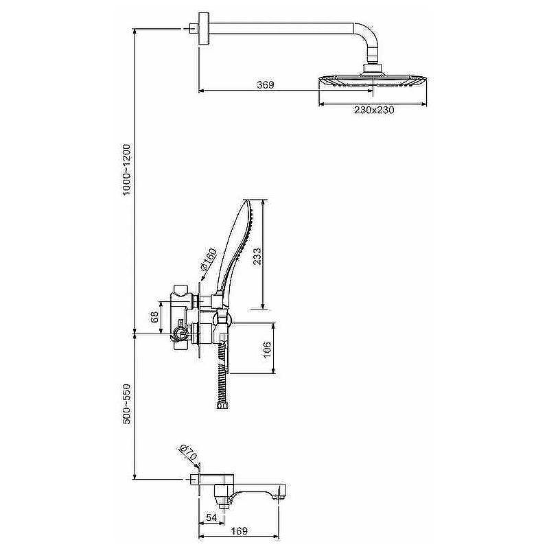 • излив для ванны длиной 169 мм (служит переключателем на лейку или верхний душ)