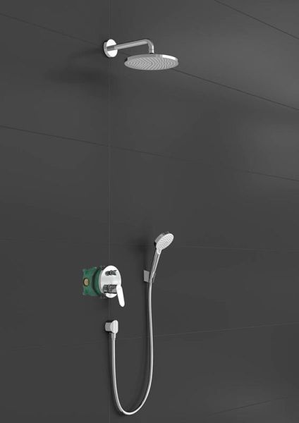 Душевая система скрытого монтажа Hansgrohe 240 1jet с однорычажным смесителем, хром, 27958000состоит из: верхний душ, ручной душ, держатель верхнего душа, однорычажный смеситель для ванны, скрытая часть, настенный вывод, держатель для душа, шланг для душа