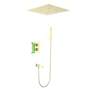 Цвет "матовое золото" никогда не выйдет из моды, во все времена драгоценныый металл был признаком богатства.Встраиваемая душевая система с термостатом Timo Petruma 5019 относится к премиальному сегменту, предназначена для монтажа в полой или твердой стене. Термостатический картридж поддерживает стабильную температуру воды, обеспечивая максимально комфортные условия для принятия водных процедур. Встроенный потолочный душ большого размера создает имитацию проливного дождя, вода обливает человека целиком. Регулируя напор воды можно получить массажное воздействие, что очень полезно для здоровья. Основные преимущества встроенной системы: элегантный внешний вид, все коммуникации и крепления спрятаны в стену и потолок, снаружи видны только декоративные элементы. Установить встроенную систему можно в любом месте. Использовать такой смеситель очень удобно, регулировка температуры воды осуществляется ручкой термостата (расположена снизу). Режим "тропический душ" и увеличение напора осуществляется поворотом ручки дивертора (расположена сверху) влево. Для переключения в режим "излив" верните ручку дивертора в исходное положение 12:00 (смеситель выключен), а затем поверните вправо. Увеличение напора воды осуществляется поворотом ручки вправо. Для переключения потока воды с режима "излив" в режим "ручной душ", поверните излив к стене. Сложностей монтажа не возникает при установке элементов душевой системы опытным сантехником. Внимательно изучите инструкцию по монтажу и эксплуатации.