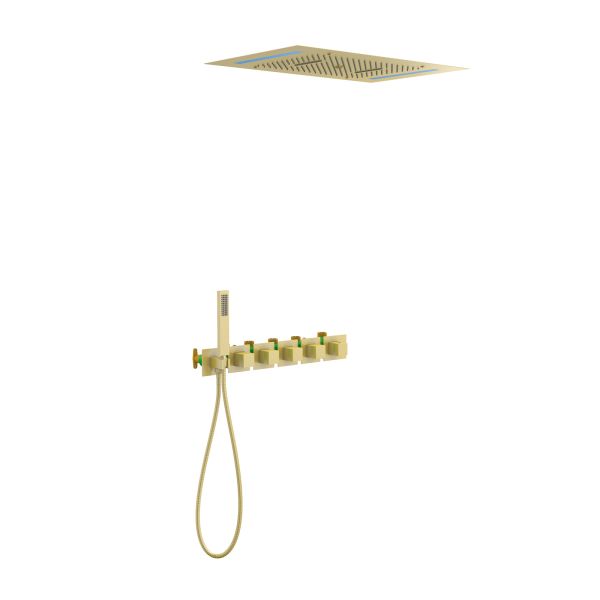 Цвет "матовое золото" никогда не выйдет из моды, во все времена драгоценный металл был признаком богатства.Встраиваемая душевая система с термостатом Timo Petruma 5229 относится к премиальному сегменту, предназначена для монтажа в полой или твердой стене. Термостатический картридж поддерживает стабильную температуру воды, обеспечивая максимально комфортные условия для принятия водных процедур. Встроенный потолочный душ большого размера создает имитацию проливного дождя, вода обливает человека целиком. Регулируя напор воды можно получить массажное воздействие, что очень полезно для здоровья. Основные преимущества встроенной системы: элегантный внешний вид, все коммуникации и крепления спрятаны в стену и потолок, снаружи видны только декоративные элементы. Установить встроенную систему можно в любом месте. Сложностей монтажа не возникает при установке элементов душевой системы опытным сантехником. Внимательно изучите инструкцию по монтажу и эксплуатации.