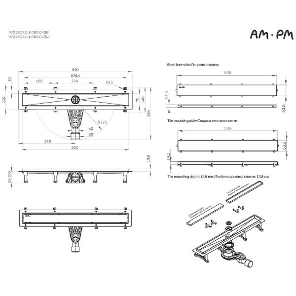 Душевой лоток AM.PM MasterFlow 60 W01SC-U11-060-04SB с решеткой Хром матовый / под плитку Tile Подробнее