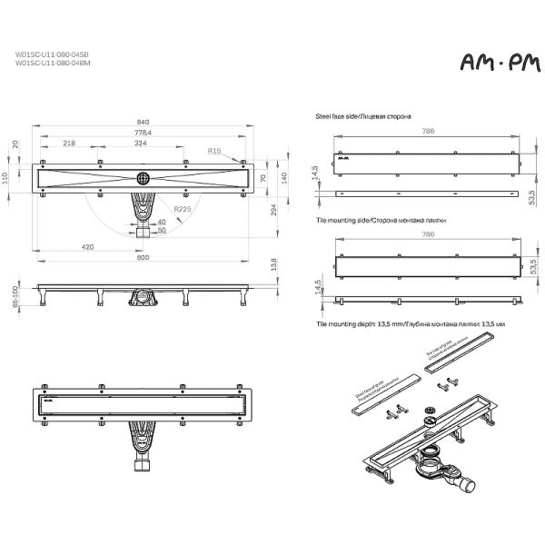 Душевой лоток AM.PM MasterFlow 80 W01SC-U11-080-04BM с Черной матовой решеткой / под плитку Tile Подробнее