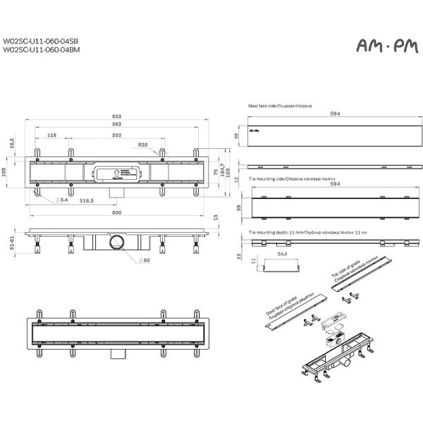 Душевой лоток AM.PM PrimeFlow 60 W02SC-U11-060-04SB с решеткой Хром матовый / под плитку Tile