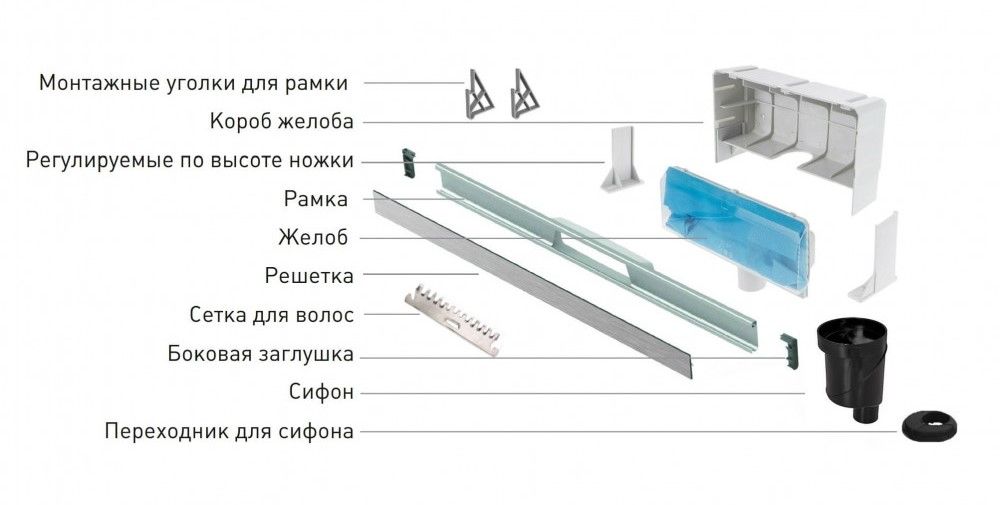 Решетка и рамка, нержавеющая сталь AISI 304Комплект регулировки рамки и монтажные углыСетка для волос, нержавеющая сталь AISI 304Комплект гидроизоляцииЖелоб водосток пристенныйPP Регулируемые по высоте ножки, пластикСамопромывной S-образный сифон с переходником PPВертикальный выпуск S-сифон D50/105мм H30/135мм, пропускная способность 42л/мин, монтаж 360°Монтажный ключ, пластик