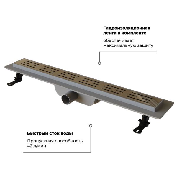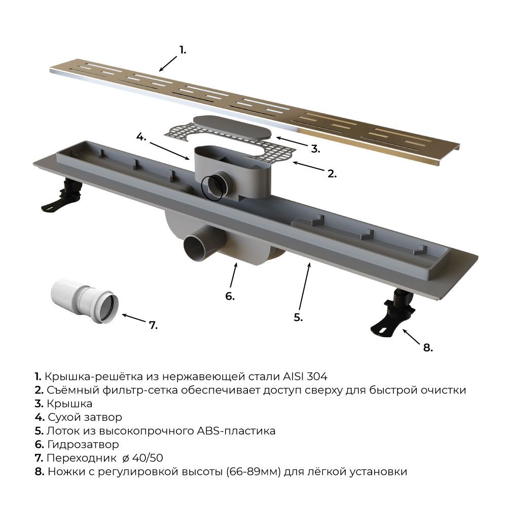 Душевой трап Leo -10 – это сантехническое изделие, созданное для отведения воды из зоны душевого пространства, выложенное керамической плиткой или мозаикой. Модельный ряд представлен в двух вариантах длины: 60 и 80 см. Трап укомплектован комбинированным затвором гидро+сухой затвор, такая конструкция позволяет на 100% исключить проникновение неприятного запаха в ванную комнату. Решётка выполнена из нержавеющей стали AISI 304, а лоток выполнен из высокопрочного ABS-пластика, такая конструкция обеспечивает максимальную надёжность конструкции более 10 лет. Для эффективного стока воды лоток трапа имеет технический уклон, а для улавливания крупного мусора и волос в конструкцию входит съёмный фильтр-сетка, с помощью которого трап с лёгкостью очищается. В комплектации присутствуют ножки с регулировкой высоты, что позволит с лёгкостью произвести монтаж трапа в пол и гидроизоляционная лента. Пропускная способность 42 л/мин.