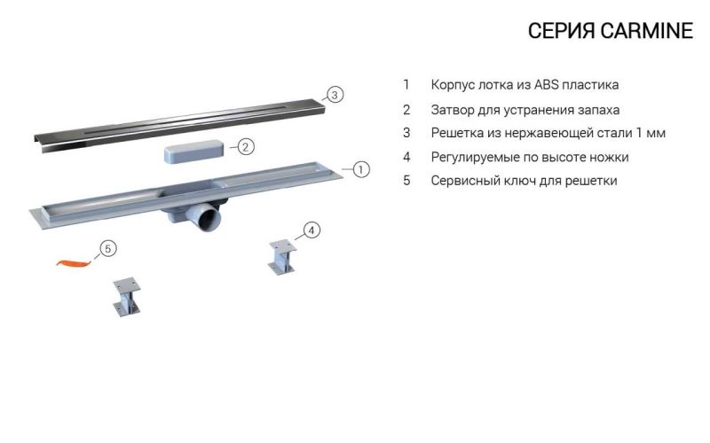 Комплектация: поворотный сифон 360 градусов из ABS-пластика, дренажный канал из ABS-пластика, водонепроницаемые уплотнительные кольца, решетка и рамка из нержавеющей стали 1 мм, противозапаховый затвор, водонепроницаемая мембрана, пластиковый сервисный ключ, комплект регулируемых по высоте опор