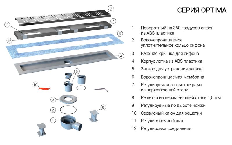 Комплектация: поворотный сифон 360 градусов из ABS-пластика, водонепроницаемые уплотнительные кольца, дренажный канал из ABS-пластика, противозапаховый затвор, водонепроницаемая мембрана, рамка и решетка из нержавеющей стали 2 мм, комплект регулируемых по высоте опор, пластиковый сервисный ключ, регулировочный винт из нержавеющей стали, регулировка соединения.