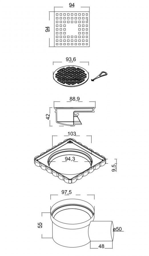 Решетка толщина 0,8 ммНержавеющая сталь AISI 304Горловина трапа пластикКомбинированный затворКорпус PP Горизонтальный выпуск D50Монтаж 360°