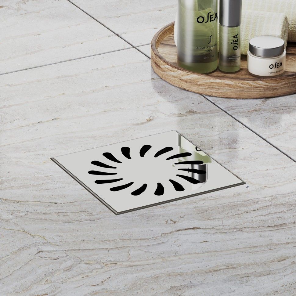 Душевой трап с рисунком на решетке SUN PAINI позволяет создать безбарьерную среду в санузле. Горизонтальный выпуск позволяет осуществить установку в стяжку от 82 мм. Размер трапа – всего 125x125 мм.Высокая пропускная способность