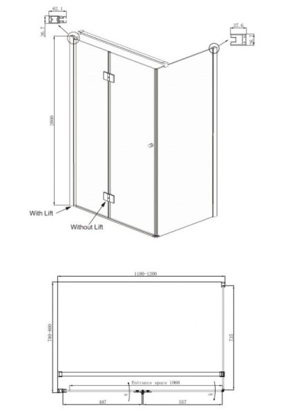 - Ширина входа: распашная часть 55.7 см, складная часть 106 см
