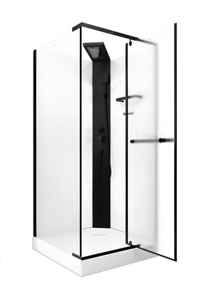 Душевая кабина квадратной формы с прозрачными передними и задними белыми непрозрачными стеклами. За счет отсутствия крыши кабина внутри хорошо просыхает. Такую модель стоит выбирать людям, которые страдают высоким давлением и плохо переносят высокую важность.