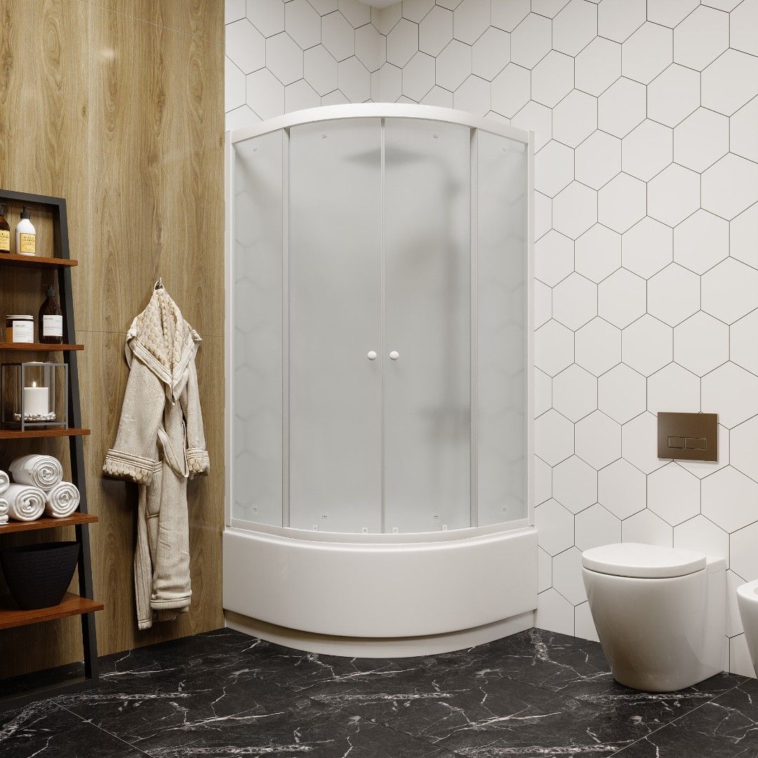 Легкосъемный экран.Достоинства:Матовое полотно скрывает человека внутри, снаружи можно рассмотреть только контуры тела.Плавный ход створок.Двери смыкаются плотно, вода наружу не просачивается.