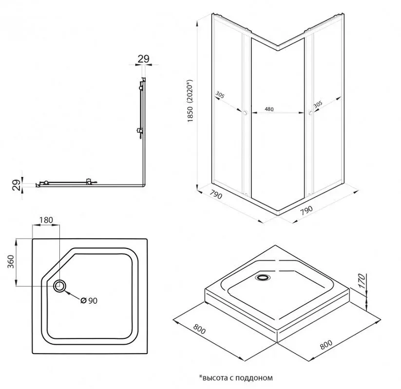 • Высота с поддоном: 202 см