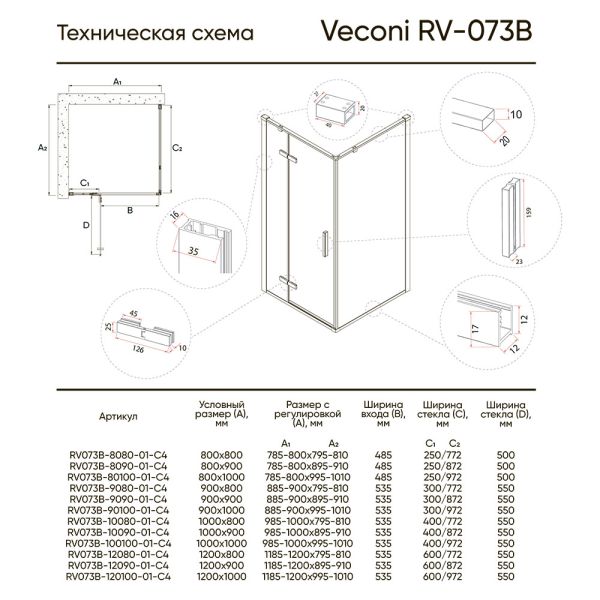 Душевой уголок Veconi Rovigo RV-073B, 800х800х1950, черный, прозрачное стекло