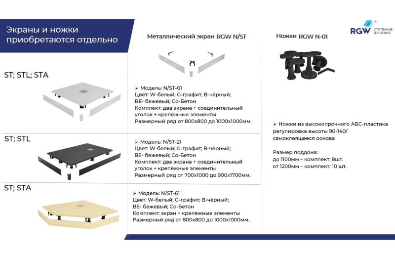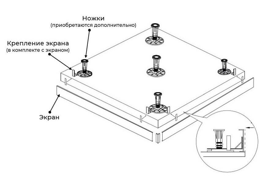 Рекомендованы ножки для поддона для установки экрана: