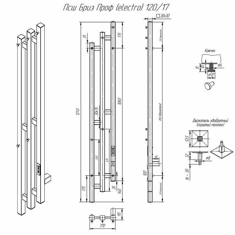 Электрический полотенцесушитель Altasan БризПроф БризПроф12017ЧМ Черный муар 120х17Данный полотенцесушитель имеет два вида подключения: подключение стандартным кабелем с вилкой 220 Вольт и скрытое подключение к заранее подведенной на месте установки проводке. Во втором случае необходимо обжать жилы проводки дополнительными клемниками (идут в комплекте) и подсоединить их к жилам полотенцесушителя, согласно цветовой разметки.