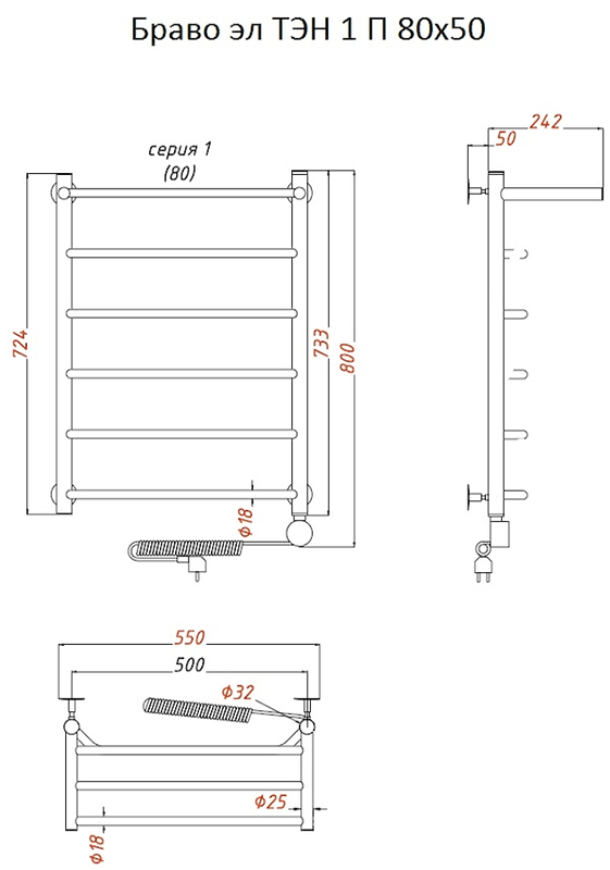 Внимание! Для скрытого монтажа электропроводки необходимо приобрести комплект скрытого подключения. Полотенцесушитель электрический комплектуется ТЭНом с терморегулятором и таймером. Изделие производится из нержавеющей стали AISI 201. Вертикальные трубы d -32 мм., для горизонтальных вставок используется труба d — 18 мм. Нагревательным элементом в полотенцесушителе является ТЭН. Полотенцесушитель заполнен бытовым антифризом.Экономичность: ТЭН нагревает антифриз до нужной температуры и выключается, далее при остывании полотенцесушителя он включается опять. Таким образом он работает не постоянно, и получается, что ТЭН потребляет электричество не 300 Вт, а порядка 100 — 150 Вт.Мощность электрического прибора порядка 100 Вт при стоимости 1 Вт — 5 руб несложно посчитать: 100Вт х 24 = 2,4 кВт в сутки. Стоимость эксплуатации изделия за сутки 2,4 кВт х 5 руб. = 12 руб. При максимальной температуре расход электричества за 30 дней составит порядка 360 руб. При условии если сушка работает круглосуточно на максимальной температуре.Удобство монтажа: Полотенцесушитель крепится к стене на четыре держателя. Изначально ТЭН не установлен в полотенцесушитель для безопасной транспортировки, его можно установить, как справа, так и слева предварительно перевернув полотенцесушитель вверх ногами и выкрутив заглушку с нужной стороны на место в которое установится ТЭН.Примечание. Внимательно изучите инструкцию по установке ТЭНа!Скрытое подключение: Для скрытого монтажа электропроводки необходимо приобрести комплект скрытого подключения.Подключение в розетку: В комплекте с ТЭНом имеется шнур с вилкой, который будет необходим при подключении к розетке.