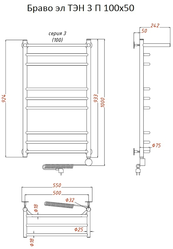 Внимание! Для скрытого монтажа электропроводки необходимо приобрести комплект скрытого подключения.Полотенцесушитель электрический комплектуется ТЭНом с терморегулятором и таймером.Изделие производится из нержавеющей стали AISI 201. Вертикальные трубы d -32 мм., для горизонтальных вставок используется труба d — 18 мм.Нагревательным элементом в полотенцесушителе является ТЭН. Полотенцесушитель заполнен бытовым антифризомЭкономичность: ТЭН нагревает антифриз до нужной температуры и выключается, далее при остывании полотенцесушителя он включается опять. Таким образом он работает не постоянно и получается, что ТЭН потребляет электричество не 300 Вт, а порядка 100 — 150 ВтМощность электрического прибора порядка 100 Вт при стоимости 1 Вт — 5 руб несложно посчитать: 100Вт х 24 = 2,4 кВт в сутки. Стоимость эксплуатации изделия за сутки 2,4 кВт х 5 руб. = 12 руб. При максимальной температуре расход электричества за 30 дней составит порядка 360 руб. При условии если сушка работает круглосуточно на максимальной температуре.Удобство монтажа: Полотенцесушитель крепится к стене на четыре держателя. Изначально ТЭН не установлен в полотенцесушитель для безопасной транспортировки, его можно установить, как справа, так и слева предварительно перевернув полотенцесушитель вверх ногами и выкрутив заглушку с нужной стороны на место в которое установится ТЭН.Примечание. Внимательно изучите инструкцию по установке ТЭНа!Скрытое подключение: Для скрытого монтажа электропроводки необходимо приобрести комплект скрытого подключения.Подключение в розетку: В комплекте с ТЭНом имеется шнур с вилкой, который будет необходим при подключении к розетке.