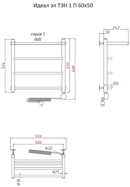 Внимание! Для скрытого монтажа электропроводки необходимо приобрести комплект скрытого подключения.Полотенцесушитель электрический комплектуется ТЭНом с терморегулятором и таймером.Изделие производится из нержавеющей стали AISI 201. Вертикальные трубы d -32 мм., для горизонтальных вставок используется труба d — 18 мм.Нагревательным элементом в полотенцесушителе является ТЭН. Полотенцесушитель заполнен бытовым антифризомЭкономичность: ТЭН нагревает антифриз до нужной температуры и выключается, далее при остывании полотенцесушителя он включается опять. Таким образом он работает не постоянно и получается, что ТЭН потребляет электричество не 300 Вт, а порядка 100 — 150 ВтМощность электрического прибора порядка 100 Вт при стоимости 1 Вт — 5 руб несложно посчитать: 100Вт х 24 = 2,4 кВт в сутки. Стоимость эксплуатации изделия за сутки 2,4 кВт х 5 руб. = 12 руб. При максимальной температуре расход электричества за 30 дней составит порядка 360 руб. При условии если сушка работает круглосуточно на максимальной температуре.Удобство монтажа: Полотенцесушитель крепится к стене на четыре держателя. Изначально ТЭН не установлен в полотенцесушитель для безопасной транспортировки, его можно установить, как справа, так и слева предварительно перевернув полотенцесушитель вверх ногами и выкрутив заглушку с нужной стороны на место в которое установится ТЭН.Примечание. Внимательно изучите инструкцию по установке ТЭНа!Скрытое подключение: Для скрытого монтажа электропроводки необходимо приобрести комплект скрытого подключения.Подключение в розетку: В комплекте с ТЭНом имеется шнур с вилкой, который будет необходим при подключении к розетке.