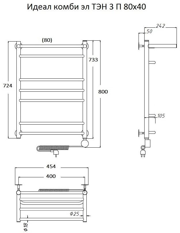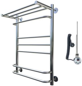 Внимание! Для скрытого монтажа электропроводки необходимо приобрести комплект скрытого подключения. Полотенцесушитель электрический комплектуется ТЭНом с терморегулятором и таймером. Изделие производится из нержавеющей стали AISI 201. Вертикальные трубы d -32 мм., для горизонтальных вставок используется труба d — 18 мм. Нагревательным элементом в полотенцесушителе является ТЭН. Полотенцесушитель заполнен бытовым антифризом.Экономичность: ТЭН нагревает антифриз до нужной температуры и выключается, далее при остывании полотенцесушителя он включается опять. Таким образом он работает не постоянно, и получается, что ТЭН потребляет электричество не 300 Вт, а порядка 100 — 150 Вт.Мощность электрического прибора порядка 100 Вт при стоимости 1 Вт — 5 руб несложно посчитать: 100Вт х 24 = 2,4 кВт в сутки. Стоимость эксплуатации изделия за сутки 2,4 кВт х 5 руб. = 12 руб. При максимальной температуре расход электричества за 30 дней составит порядка 360 руб. При условии если сушка работает круглосуточно на максимальной температуре.Удобство монтажа: Полотенцесушитель крепится к стене на четыре держателя. Изначально ТЭН не установлен в полотенцесушитель для безопасной транспортировки, его можно установить, как справа, так и слева предварительно перевернув полотенцесушитель вверх ногами и выкрутив заглушку с нужной стороны на место в которое установится ТЭН.Примечание. Внимательно изучите инструкцию по установке ТЭНа!Скрытое подключение: Для скрытого монтажа электропроводки необходимо приобрести комплект скрытого подключения.Подключение в розетку: В комплекте с ТЭНом имеется шнур с вилкой, который будет необходим при подключении к розетке.