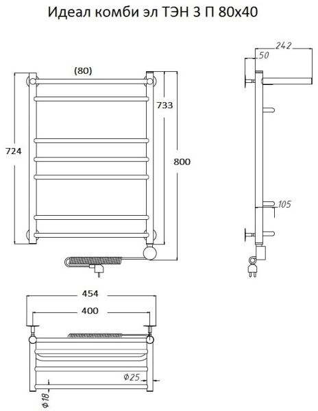 Электрический полотенцесушитель Тругор Идеал комби 3 П с полкой 80x40см хром Идеал/комби3/элТЭН8040П купить