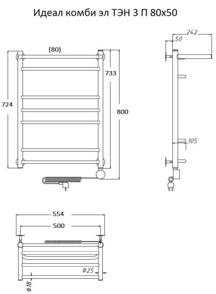 Электрический полотенцесушитель Тругор Идеал комби 3 П с полкой 80x50см хром Идеал/комби3/элТЭН8050П