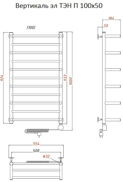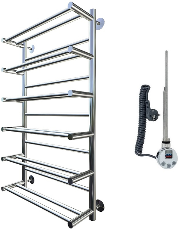 Внимание! Для скрытого монтажа электропроводки необходимо приобрести комплект скрытого подключения.Полотенцесушитель электрический комплектуется ТЭНом с терморегулятором и таймером.Изделие производится из нержавеющей стали AISI 201. Вертикальные трубы d -32 мм., для горизонтальных вставок используется труба d — 18 мм.Нагревательным элементом в полотенцесушителе является ТЭН. Полотенцесушитель заполнен бытовым антифризомЭкономичность: ТЭН нагревает антифриз до нужной температуры и выключается, далее при остывании полотенцесушителя он включается опять. Таким образом он работает не постоянно и получается, что ТЭН потребляет электричество не 300 Вт, а порядка 100 — 150 ВтМощность электрического прибора порядка 100 Вт при стоимости 1 Вт — 5 руб несложно посчитать: 100Вт х 24 = 2,4 кВт в сутки. Стоимость эксплуатации изделия за сутки 2,4 кВт х 5 руб. = 12 руб. При максимальной температуре расход электричества за 30 дней составит порядка 360 руб. При условии если сушка работает круглосуточно на максимальной температуре.Удобство монтажа: Полотенцесушитель крепится к стене на четыре держателя. Изначально ТЭН не установлен в полотенцесушитель для безопасной транспортировки, его можно установить, как справа, так и слева предварительно перевернув полотенцесушитель вверх ногами и выкрутив заглушку с нужной стороны на место в которое установится ТЭН.Примечание. Внимательно изучите инструкцию по установке ТЭНа!Скрытое подключение: Для скрытого монтажа электропроводки необходимо приобрести комплект скрытого подключения.Подключение в розетку: В комплекте с ТЭНом имеется шнур с вилкой, который будет необходим при подключении к розетке.