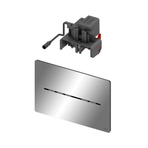 Электронная панель смыва с гигиеничной бесконтактной активацией смыва для стандартных бачков ТЕСЕ (глубиной 13 см) с фронтальной активацией и высотой высотой установки около 1 м (центр панели смыва). Плоская панель из нержавеющей стали в комплекте с крепежными элементами, герметичным отсеком для батарей для установки внутри бачка (4 батареи тип Mono/D/LR 20) и электроприводом смыва для систем двойного смыва. Совместима с контейнером для гигиенических таблеток.