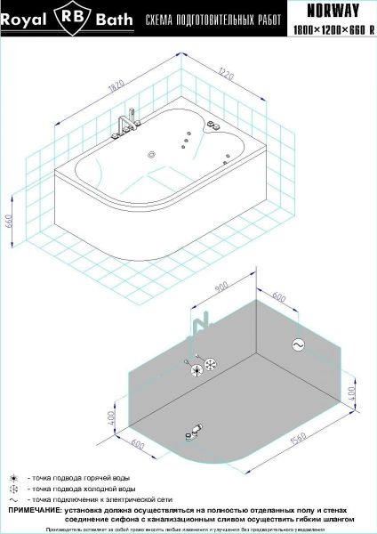 Акриловая ванна Royal Bath - идеальный выбор для создания атмосферы релакса и умиротворения, как в просторной в ванной комнате, так и в комнатном санузле. Основным преимуществом ванны из акрила считается её малый вес, высокая гигиеничность данного материала и низкая теплопроводность, долго сохраняющая комфортную температуру воды.Форма ванны Royal Bath замечательно подойдет к любому интерьерному решению, в различных вариантах размещения внутри ванной комнаты. Пристенная установка - это наиболее традиционный вид установки, а при использовании декоративного экрана пространство под ванной можно использовать как место хранения моющих средств. Оптимальная глубина позволяет принимать ванну с максимальным комфортом и полным расслаблением. Ванна Royal Bath выполнена со строгим соблюдением всех значительных элементов современного стиля.Благодаря тому, что родина бренда Royal Bath - Россия, можно смело быть уверенным в непревзойденном качестве и долговечности ванны, так как производство полностью соответствует стандартам качества. Акриловая ванна Royal Bath - это незаменимый, основной элемент любой ванной комнаты, без которого невозможно обойтись, ни в многоквартирном доме, ни в загородном коттедже.Комплектация гидромассажной ванны:- акриловая ванна Norway 180x120x66 с каркасом;- панель фронтальная к ванне Norway;- гидромассажная система на 6 форсунок;- спинной массаж на 6 форсунок;- слив-перелив для ванны полуавтомат 60 см.Ожидаемый срок поставки 7 дней.Обратите внимание: данная позиция поставляется под заказ! Товар поставляется по 100%-ной предоплате.Данный товар является заказным и имеет индивидуально-определенные свойства.
