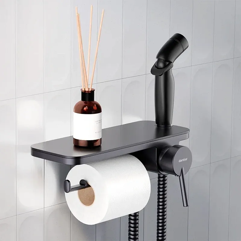 Гигиенический душ со смесителем Damixa Jupiter 773500301 черный встраиваемыйВстраиваемый гигиенический душ со смесителем Damixa Jupiter, полкой, шлангом 1200 мм и держателем для туалетной бумаги. Современное решение для вашего удобства и гигиены теперь в новом исполнении: смеситель с гигиеническим душем отличается простотой и комфортом в использовании, а еще он выглядит невероятно стильно. Размер (Ш/Г/В): 263x135x249 мм. Материал - латунь, пластик. Цвет - черный. 1 режим гигиенического душа - Spray.