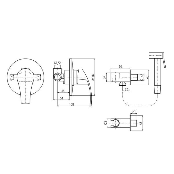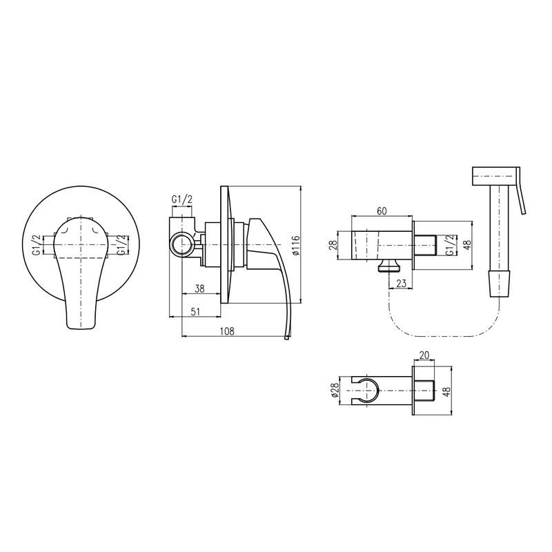 Комплектация: смеситель, лейка, шланговое подключение с держателем лейки, шланг, внутренняя часть