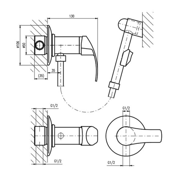 Комплектация: смеситель, лейка, держатель лейки, шланг, внутренняя часть