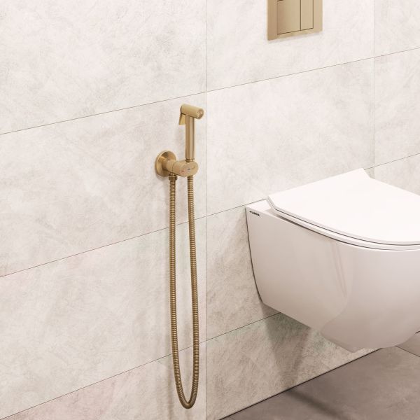 Самый миниатюрный комплект Гигиенического душа золотого цвета со смесителем и краном держателем лейки, скрытого монтажа RGW SP-213Gb, с прогрессивным поворотным картриджем, оснащён функцией «Умная блокировка». Гигиенический душ со смесителем круглой формы, инсталляционный, встройка в стену RGW SP-213Gb— это сантехническое оборудование, придуманное для соблюдения личной гигиены. Обычно его устанавливают возле унитаза, тем самым в небольших пространствах ванных комнат он заменяет биде. Первое, что приходит на ум, когда слышите «Гигиенический душ для унитаза (гигдуш — в бытовом разговоре)» — это моментальная гигиена интимной зоны сразу после туалета без использования туалетной бумаги.Однако в современном быту гигиенический душ для туалета и биде приобретает и другие сценарии использования, например: