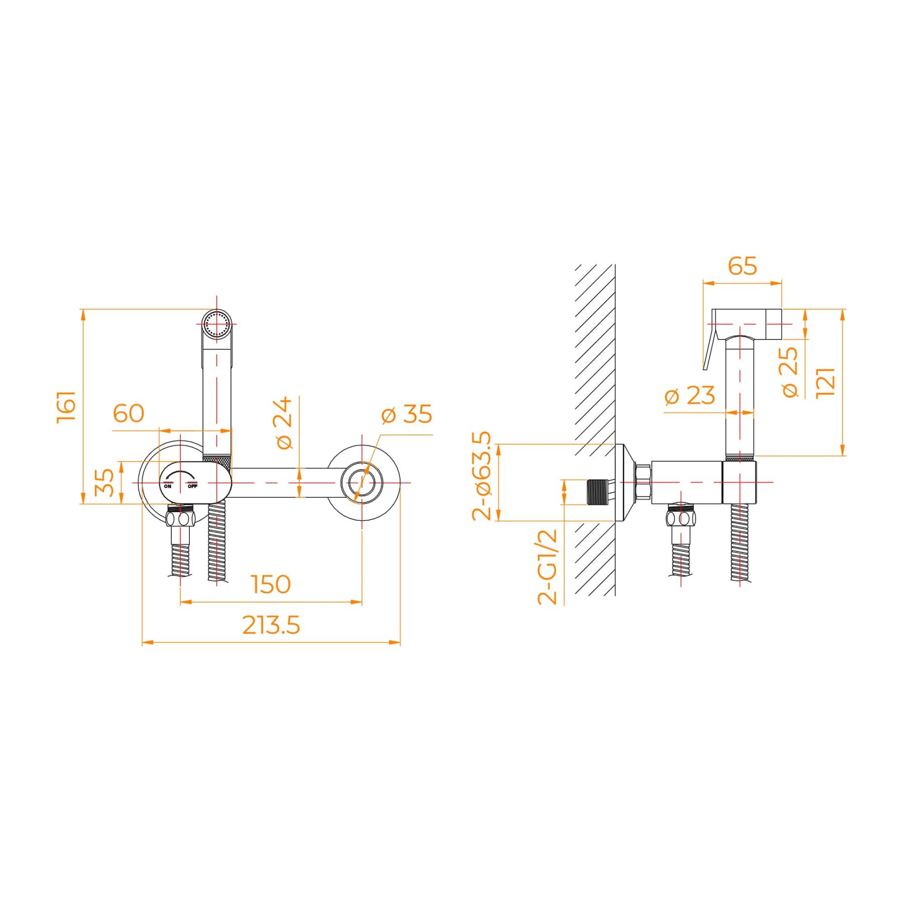 Смеситель пристенный (наружный) с прогрессивным керамическим картриджем на два монтажных отверстия (диаметр монтажных отверстий — 35 мм, ширина монтажных отверстий — 150 мм).Смеситель округлой формы с однорычажным управлением и встроенной опорой для лейки, лейка имеет среднюю струю подачи воды. Струя из гигиенического душа выходит плотная, упругая и направленная. Она может быть как мягкой рассеянной, так и интенсивной, в зависимости от выбранного напора воды. Её температура легко регулируется от прохладной до комфортной тёплой. Вода подаётся равномерно, без пульсаций, обеспечивая точное и аккуратное использование. Форма струи в этой модели узконаправленная, что делает её удобной для гигиенических процедур.Смеситель однорукий с подводкой двух потоков воды - горячей и холодной. При установке межосевое расстояние можно регулировать в диапазоне от 135 до 165 мм за счет эксцентриков.Лейка гигиены оснащена рычагом включения потока воды с плавной пружиной регуляции потока.Гибкий шланг «RGW – Стильные душевые» не дешевое изделие. Он состоит из наружной металлической оплетки и внутренней водяной трубки из силикона. Внутренняя силиконовая трубка более долговечна, лучше выдерживает перепады давления и гидравлические удары, не ломается со временем, как резина, и не способствует появлению грибка и плесени.Шланг длиной 120 см имеет защиту от заломов и перекручивания.Требование к установке: месторасположение должно быть известно заранее, чтобы сделать подводку труб на этапе черновых работ. Обычно смеситель устанавливают на высоте 50 см от пола.
