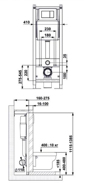 Узкая рама шириной 41 см.Металлический каркас, окрашенный антикоррозийной эмалью.Расчетная нагрузка 400кг. Объём резервуара воды 10 л с тепло- и шумоизоляцией.Подвод воды внутрь резервуара (G1/2 наружная).Объем смыва 3/6 литра с возможностью регулировки.Управление механическое, две кнопки.Межосевое расстояние под шпильки для подвеса унитаза 18 и 23 см.