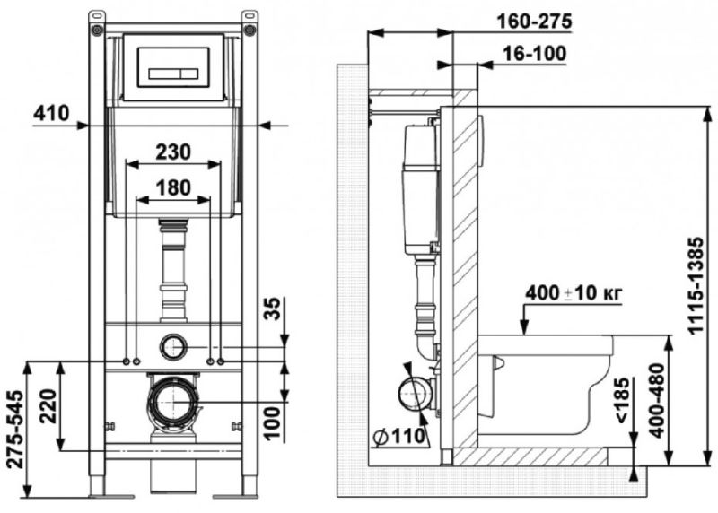 Стальная рама с антикоррозийным покрытиемРасчётная нагрузка до 400 кгНожки регулировкой высотыМежосевое расстояние под крепежные шпильки унитаза 18 и 23 смБачок с функцией шумоподавленияДвухрежимная кнопка смыва, черное покрытие Soft TouchЭконом слив 3л, полный слив настраивается от 5,5 до 8,5лМонтажный кнопочный узел, полный комплект патрубков, лекала для монтажа отверстий.