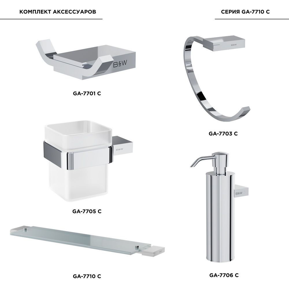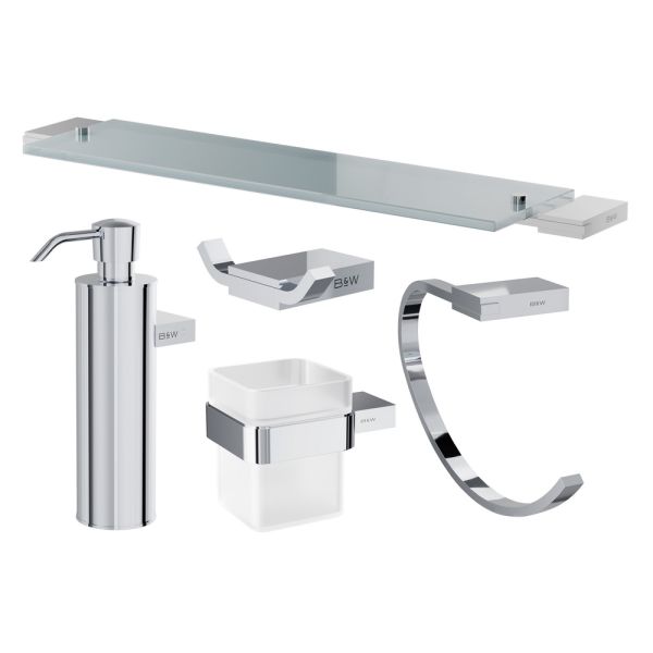 Комплект аксессуаров для ванной комнаты Black and White 7710C хром Для тех, кто любит четкие четкость, структурированность и правильную геометрию. Прямые углы и незатейливые изгибы, чтобы было стильно и изысканно. Вечная классика с элементами новейших тенденций. Коллекция выполнена из надежных материалов: латунь и закаленное стекло, именно это позволяет не беспокоиться о надежности и увеличенном сроке службы каждого изделия. Соберите полную коллекцию из двух наборов, чтобы не думать о том, чего же еще не хватает.