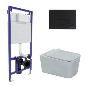 Полный комплект BERGES для монтажа подвесного унитаза. 1. Инсталляция NOVUM525Толщина бачка 80 мм.Межосевое расстояние под крепежные шпильки унитаза 18 и 23 см.Резервуар воды объемом 10 литров с тепло-шумоизоляцией.Уровень шума при давлении 3 бар не превышает 13 дБ.Подвод воды сверху (G1/2 наружная).Объем смыва 3/6 литра с возможностью регулировки. Металлический каркас, окрашенный антикоррозийной эмалью, расчетная нагрузка до 400 кг.Ножки регулировки высоты из оцинкованной стали. Возможность установки в угол. 2. кнопка D5 Soft Touch чернаяABS-пластик 3. унитаз FLOE Rimless,безободковая система смыва, антибактериальное покрытиеэкономия воды, скрытый крепеж 4. сиденье дюропласт Floe Slim SOмикролифт, быстросъем. Все крепежи для установки в комплекте