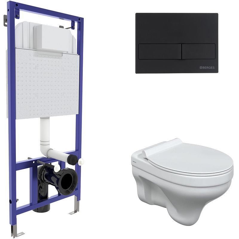 Комплект Berges 4в1 042439: инсталляция NOVUM кнопка L5 SoftTouch чёрная унитаз Albit S сиденье Top Slim SO