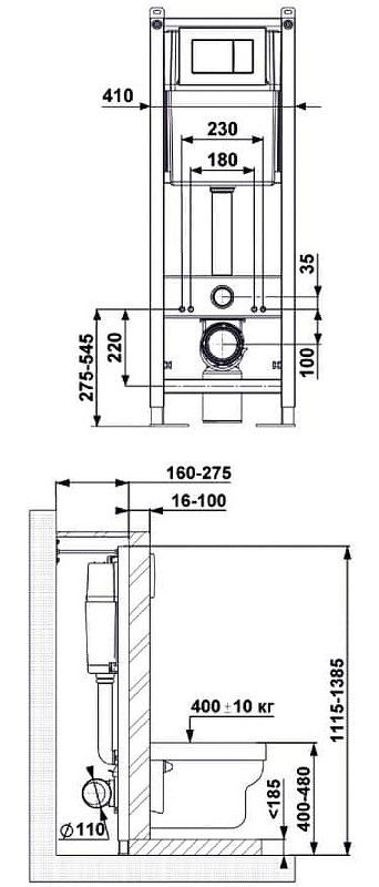 Инсталляция с кнопкой:Узкая рама шириной 41 см.Металлический каркас, окрашенный антикоррозийной эмалью.Расчетная нагрузка 400кг. Объём резервуара воды 10 л с тепло- и шумоизоляцией.Подвод воды внутрь резервуара (G1/2 наружная).Объем смыва 3/6 литра с возможностью регулировки.Управление механическое, две кнопки.Межосевое расстояние под шпильки для подвеса унитаза 18 и 23 см. Унитаз:Ободковый унитаз OKUSДушевой смывКомпактная модель 48смСкрытый крепежСиденье дюропласт Toma Slim SO:микролифт, быстросъем