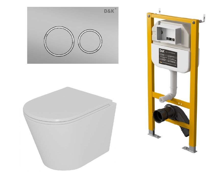 Комплект Унитаз подвесной безободковый (торнадо) DQ Venice DT1026516, 515*355*365мм, сиденье микролифт, белый+Инсталляция рамная скрытого монтажа DQ DI8050127, 500*117*1270мм, для подвесного унитаза, универсальная+Клавиша смыва DQ Bayern DB1529002, матовый хром