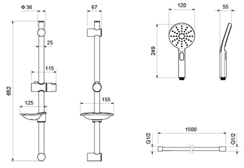 • Душевой гарнитур: душевая стойка с мыльницей, лейка, шланг