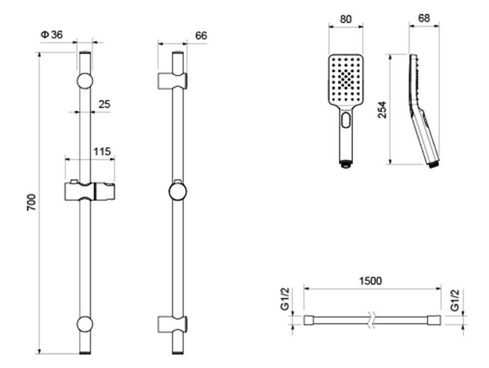 • Душевой гарнитур: душевая стойка, лейка, шланг