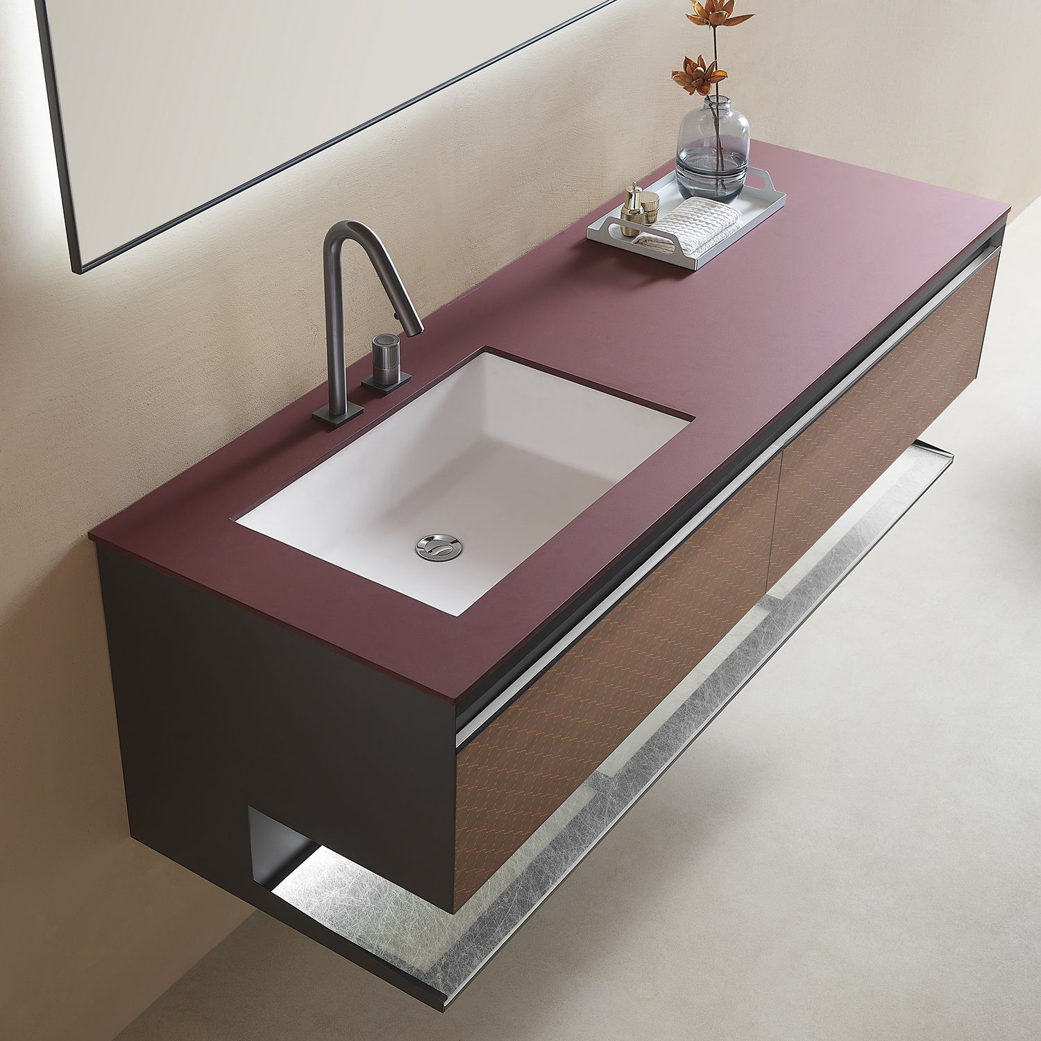 Данное изделие из премиальной линейки изготовлено из высокоресурсных и износостойких материалов.Тумба выполнена из многослойного листа, включающего основание из алюминиевой решетки в форме сот для звукоизоляции и дополнительного ребра жесткости, поверх которого крепятся листы из нержавеющей стали SUS 304.Также дополнительно наносится слой антикоррозионного состава и в заключении осуществляется покраска влагостойкой эмалью. На фасадах установлены панели из массива дерева обработанные деликатным травлением, для придания яркости текстуры волокна. Столешница изготовлена из итальянских панелей Fenix, которые производят из натурального камня и отличаются повышенной износоcтойкостью , а чаша выполнена из искусственного камня на основе минералов – Corian.Для хранения предусмотрены два выдвижных ящика, оснащенных механизмом открывания Unihopper,а также в нижней части базы расположена открытая ниша с антуражной подсветкой, которая срабатывает при приближении человека от 3-х метров. Зеркало имеет основание из листа нержавеющей стали и оснащается контурной подсветкой , а также функцией антизапотевания.