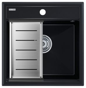 Материал мойки устойчив к сколам, царапинам и деформациям. На горизонтальных гранях чаши мойки предусмотрены специальные выступы-ступеньки, которые позволяют использовать такие аксессуары, как ролл-маты, доски, коландеры и прочие для создания дополнительной рабочей поверхности на кухне. Дно чаши мойки имеет 4 грани, направленных к сливу под индивидуальным градусом для максимально быстрого ухода воды.