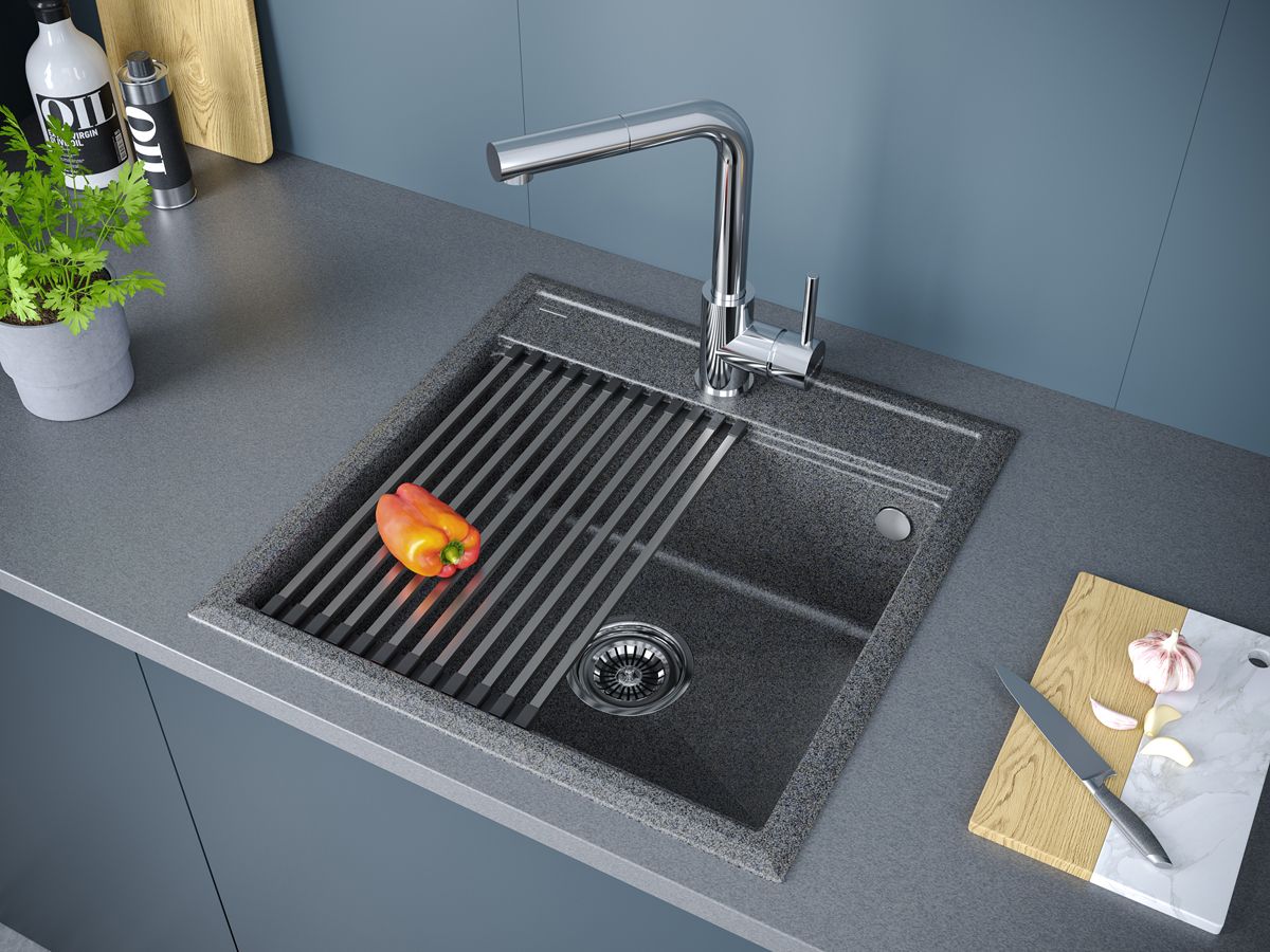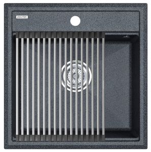 Комплект мойка STEPIA 50 + ролл-мат STEP, PM115051-DG+R375-BSСтильный и многофункциональный комплект мойки из композитного материала на основе гранита и ролл-мата из высококачественной нержавеющей стали для создания комфортной рабочей зоны на вашей кухне.Мойка STEPIA 50 изготовлена из IT-GRANIT – композитного материала на основе гранита, благодаря чему мойка не потеряет свой первоначальный цвет за многие годы использования даже при длительном воздействии солнечных лучей. Материал мойки устойчив к сколам, царапинам и деформациям. На горизонтальных гранях чаши мойки предусмотрены специальные выступы-ступеньки, которые позволяют использовать такие аксессуары, как ролл-маты, доски, коландеры и пр. для создания дополнительной рабочей поверхности на кухне. Дно чаши мойки имеет 4 грани, направленных к сливу под индивидуальным градусом для максимально быстрого ухода воды.