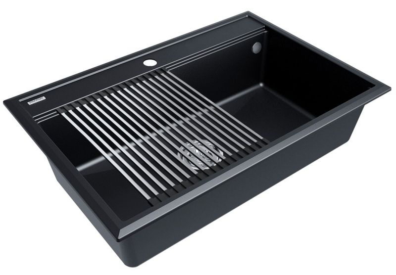 Комплект мойка STEPIA 80 + ролл-мат STEP, PM117551-BLM+R375-BSСтильный и многофункциональный комплект мойки из композитного материала на основе гранита и ролл-мата из высококачественной нержавеющей стали для создания комфортной рабочей зоны на вашей кухне.Мойка STEPIA 80 изготовлена из IT-GRANIT – композитного материала на основе гранита, благодаря чему мойка не потеряет свой первоначальный цвет за многие годы использования даже при длительном воздействии солнечных лучей. Материал мойки устойчив к сколам, царапинам и деформациям. На горизонтальных гранях чаши мойки предусмотрены специальные выступы-ступеньки, которые позволяют использовать такие аксессуары, как ролл-маты, доски, коландеры и пр. для создания дополнительной рабочей поверхности на кухне. Дно чаши мойки имеет 4 грани, направленных к сливу под индивидуальным градусом для максимально быстрого ухода воды.