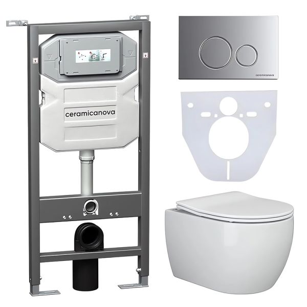Сет 4 в 1: CN3001_1001M_1000Подвесной унитаз PLAY Rimless арт. CN3001Шумоизоляционная панель для инсталляции арт. CN1000Система инсталляции для унитазов CERAMICANOVA Envision с кнопкой смыва Round цвет хром матовый и креплениями, арт. CN1001MПодвесной унитаз Play Rimless CN3001, глубокий смыв, с крепежом для полностью скрытого монтажа, ультра тонким с сидением и крышкой с функцией плавного закрытия, дюропласт.Шумоизоляционная панель для инсталляции, арт. CN1000